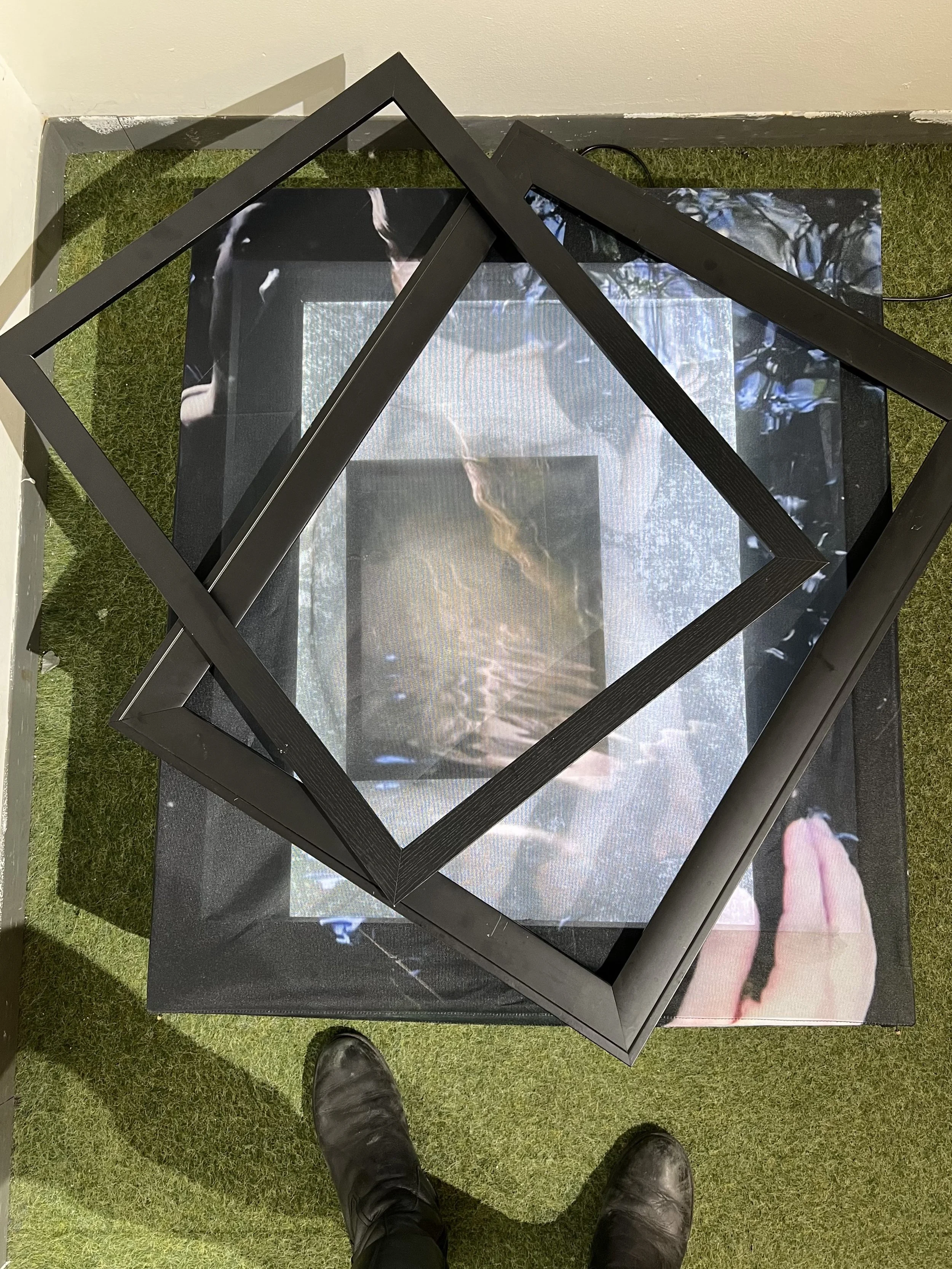 mixed media installation, rope, wood, mirror, 3d print, nails, dried petals